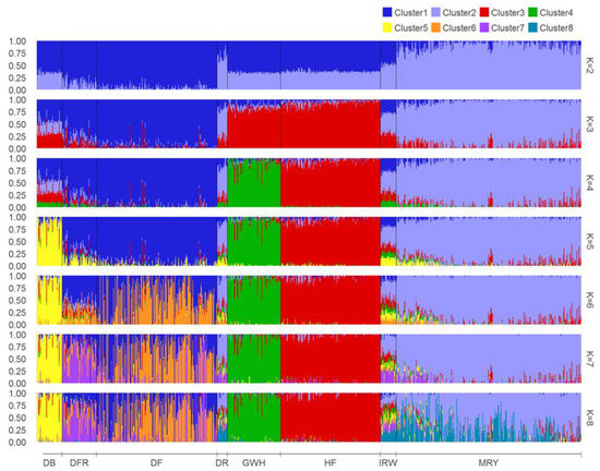 Population structure as estimated by fastSTRUCTURE divided into 2–8 clusters (K) for each breed (ordered alphabetically). DB: Dutch Belted; DF: Dutch Friesian; DFR: Dutch Friesian Red and White; DR: Deep Red; GWH: Groningen White Headed; HF: Holstein Friesian; IRW: Improved Red and White; MRY: Meuse-Rhine-Yssel.