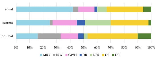 Summed contribution per native breed in the gene bank based on equal contributions across bulls, current contributions based on straws per bull, and optimal contributions based on minimizing the mean genetic similarity. DB: Dutch Belted; DF: Dutch Friesian; DFR: Dutch Friesian Red and White; DR: Deep Red; GWH: Groningen White Headed; IRW: Improved Red and White; MRY: Meuse-Rhine-Yssel.