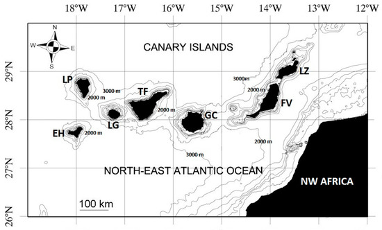 The Canary Islands are an oceanic archipelago of volcanic origin located in the eastern Atlantic Ocean (27.68–29.58 °N; 18.28–14.58 °W) (Figure 1). Each island has arisen from an independent volcanic system except the easternmost islands (Fuerteventura and Lanzarote), which share the same insular platform; therefore, large depths are found between adjacent islands. Fuerteventura island is located at ca. 94 km offshore the NW African coast, while El Hierro, the westernmost island, is at ca. 450 km offshore. There are strong influences of the Canary Current and the African Upwelling System on the oceanographic patterns of the Canarian Archipelago [47]. In brief, there is an oceanographic gradient in terms of Sea Surface Temperatures (SST) and productivity, with warmer (ca. 1–2 °C, occasionally 3 °C) and more oligotrophic (ca. 145 g C m−2 yr−1 vs. 237 g C m−2 yr−1) waters in the westernmost (El Hierro) relative to the easternmost islands (Fuerteventura and Lanzarote), which are under more cooler conditions [48,49]. This large-scale spatial variability across an east to west gradient influences the composition and structure of intertidal and shallow subtidal assemblages on opposite sides of the Canary Islands [50,51].