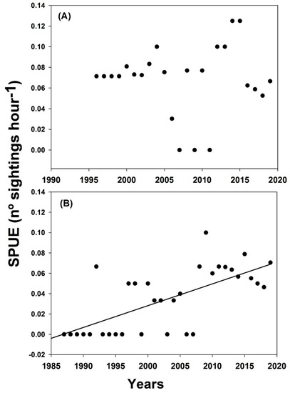 Sightings per unit of effort (SPUE), from 1990 to 2019, of the Spotfin burrfish, Chilomycterus reticulatus, in the islands of (A) El Hierro and (B) Gran Canaria. See Table 1 for model adjustments. The linear trend was only included for significant temporal trends.