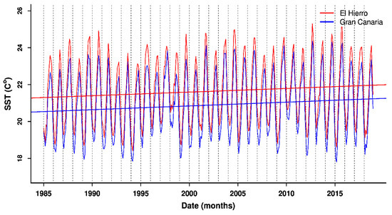 Sea Surface Temperature (SST) monthly time series for El Hierro (red) and Gran Canaria (blue), including their corresponding linear trends.