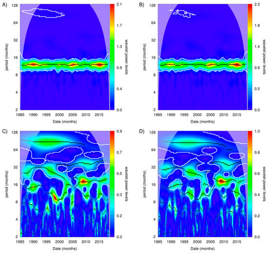 SST wavelet for (A) El Hierro and (B) Gran Canaria, and SST anomaly wavelet for (C) El Hierro and (D) Gran Canaria.