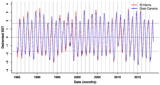 Detrended SST time series for El Hierro (red) and Gran Canaria (blue). Dashed lines accounts for +1 and –1 of the standard deviation.