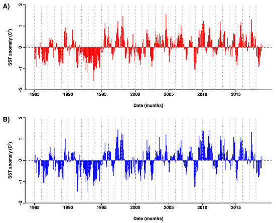 The SST time series for both El Hierro and Gran Canaria showed a significant trend of linear increase over time (Figure 4, p-value < 0.01), including a yearly Sen’s slope of 0.021 °C y−1 for both islands. The SST wavelet analysis for El Hierro (Figure 5A) and Gran Canaria (Figure 5B), which accounts for significant yearly frequencies, showed a weakening for the periods around 1998 and 2010. This weakening was related to the relatively high winter temperature minima, and not high summer maxima, for these years (Figure 4 and Figure 6). The SST anomaly wavelet analysis for both El Hierro (Figure 5C) and Gran Canaria (Figure 5D) displayed a period of intense energy around 2010, for a frequency of 18 months. In Gran Canaria, a moderate peak in energy was also observed in 1998 for a yearly frequency (Figure 5D). The high energy for these years (1998 and 2010) was connected with a relatively large period of positive SST anomalies (Figure 7).
