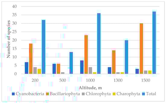 Altogether 82 taxa of algae and cyanobacteria were revealed in phytoperiphyton. The Bacillariophyta was the richest with 51 species, including Nitzschia with 9 taxa and Cymbella with 6 taxa as the richest genera. Cyanobacteria were represented by 20 taxa, Chlorophyta by 7, and Charophyta by 4 taxa. Green and charophyte algae enriched the periphyton communities at the altitude of about 200 m a.s.l. (Figure 2). At the altitudes up to 1000 m a.s.l., 36 algae species were revealed. The most common species were from diatoms Cymbella, Diatoma, and Encyonema as well as planktonic or planktonic-benthic cyanobacteria from Phormidium, Planktolyngbya, and Pseudanabaena. At the altitudes of about 1500 m, there were mostly diatoms of the genera Diatoma, Encyonema, Cymbella, Nitzschia, and Surirella.