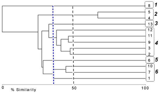 Dendrogram of the similarity of the species composition of periphyton in the examined parts of the Arys River basin, June 2016. The numbers and descriptions of the clusters are given in Table 4.