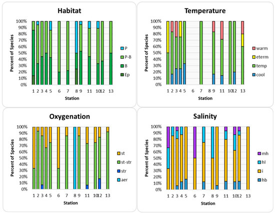 The uniqueness of the species composition of the periphyton communities is due to the variety of conditions in the Arys River basin. The analysis showed that fouling complexes consisted mainly of benthic and plankton-benthic species (Figure 4). Under conditions of a slower course of down parts of the basin (st. 5,8,9,10), the proportion of planktonic species in communities increased. Indicators of temperature conditions are represented mainly by moderately thermophilic species. In the middle course of the Arys River (st. 2, 3), as well as in the rivers Aksu, Badam, and Zhilanda with a relatively slow stream (st. 8, 11, 13), the proportion of thermophilic species increased. Regarding oxygen conditions, species that were indicators of weakly and moderately saturated oxygenated waters prevailed. Aerophiles that preferred conditions with a high oxygen content were noted only in the phytoperiphyton community of the Aksu River (st. 8). Indifferent species inhabiting a wide range of salinity prevailed in all studied communities. In the Arys River (st. 1–5), the phytoperiphyton communities were enriched by mesohalobes, which prefer waters with a significant saturation with chlorides.