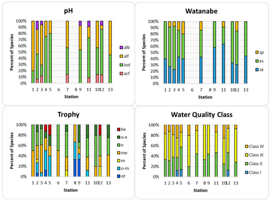 Indicators of neutral or slightly alkaline waters prevailed in the phytoperiphyton communities of the studied basin (Figure 5). The ecological preferences of algae species indicated alkaline conditions in the Arys River. Alkaliphiles and alkalibionts comprised from 25 to 55% of the species composition of communities in the remaining parts of the basin. Watanabe organic pollution indicators included only diatom species. Indicators of pure water accounted for from 20 to 65% of phytoperiphyton communities. According to the change in the proportion of species—indicators of polluted waters, the organic pollution of the Arys River water increased downstream. Some of the algae species belonged to saprophiles (st. 7, 11, 12) like Nitzschia gracilis, N. palea. The proportion of eurysaprobes varied from 25 to 70%. According to the values of the saprobity index SI, indicators of moderately polluted waters prevailed in the composition of all periphyton communities. The proportion of oligotrophic and mesotrophic species increased from the upper to the lower sections of the Arys River. At the same time, in the lower reaches of the river (st. 4, 5), there was a noticeable proportion of hypereutrophic species. The waters of the tributaries Jabaglysu, Jetimsay, Sayramsu, Jilandy, and the average course of the Badam River (st. 6, 7, 10, 11, 13) can be estimated as mesotrophic. In the lower reaches of the Badam River (st. 12), the presence of hypereutrophic species is noticeable. Oligotrophic species prevailed only in the community of the Aksu River (st. 8).