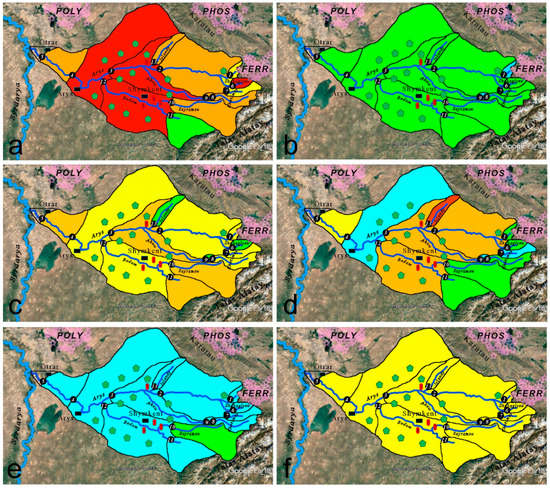 Ecological mapping of the Arys River basin. Transparency (a), permanganate index (PI) (b), nitrite-nitrogen content (c), nitrate-nitrogen content (d), ammonium-nitrogen content (e), the saprobity index SI (f). The regions toned in respect of Class of Water Quality in European Union (EU) color code as in Table 4: Class 1, very pure–blue, Class 2, pure–green, Class 3, moderate–yellow, Class 4, polluted–orange, Class 5, very polluted–red.