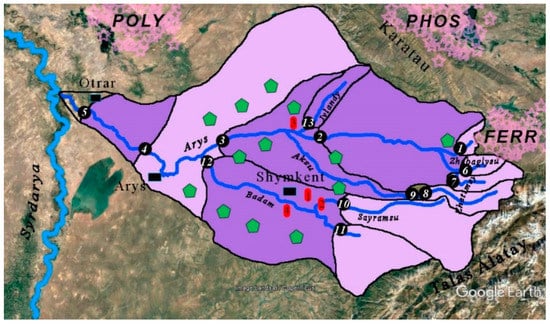 The territory of the Arys River basin is one of the most densely populated in Kazakhstan [26]. It is used to grow cereals, cotton, rice, vegetables, grapes, and as pastures for sheep and camels (Figure 1). The region is rich in deposits of minerals [1]. Phosphorites, rare earth, and fluorine are mined in the Karatau Mountains (Figure 1, PHOS). There are deposits of polymetallic (Figure 1, POLY) and iron ores (Figure 1, FERR) in the river basin. Mineral processing industrial enterprises are located in the cities of Shu, Arys, Karatau, as well as in small towns (Figure 1, Red polygons).