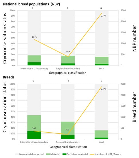 Cryoconservation status according to the geographical categories is different when considering NBP or breeds (