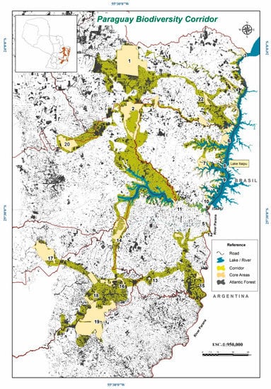 The Atlantic forest of South America has been identified as one of the most important biodiversity hotspots of the planet. It is a complex of 15 terrestrial eco-regions of tropical and sub-tropical humid forests [1] with the highest concentration of plant and vertebrate endemism. With only 8% of its original extent remaining as a consequence of the degradation imposed by human activities, today, this ecoregion is considered one of the most endangered biomes [2,3]. Originally, the forest covered one tenth of the south American continent, extending from Río Grande do Norte and Ceará south to Río Grande do Sul in Brazil, Northeast of Argentina and east of Paraguay, with a total of 1,233,875 km2 [3]. In Paraguay, the Upper Parana Atlantic forest (UPAF) eco-region encompasses more than 88,000 km2. It was almost “intact” until 1940, its degradation being mainly due to selective logging [4]. Seventy percent of the forest remained at the beginning of 1970s, but during the following 30 years it was reduced significantly to less than 25% [5]. Between 2003 to 2013, 6000 km2 of forest were lost, with the deforestation rate of 1.8% per year of the remnant of the UPAF [6].