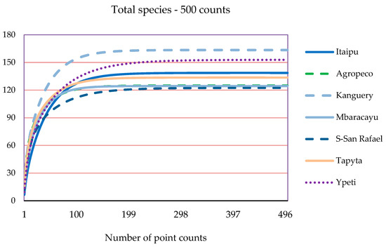 Due to difference in bird count efforts, we analyzed data clustering point counts in some areas as defined in Table 2. Species-accumulation curves and species richness estimators were computed using EstimateS, version 9.1.0 [36]. We used sample-based incidence data randomizations of the clustering point counts. In each randomization, sampled species were drawn randomly from the data set without replacement and added to the curve in a random order. We used 100 runs of randomized sampling order and extrapolated the rarefaction curves to a total of 500 samples.