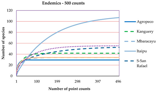 Species accumulation curves for grouped core areas (see Section 2.3) of all bird species recorded during 318 10-point count stations showed that estimation of bird richness did not depend on sample efforts, as bird richness estimation for some areas were higher even with lower number of samples than others. Bird richness obtained through an extrapolation to 500 counts for each grouped core area, estimated for Kanguery (center of the reserve) 163.5 (95% C.I. = 111.4–215.5) bird species with a sample of only 26 10-min point counts, while at south of San Rafael it is estimated to be 122.4 (103.9–140.9) with a total of 72 10-min point counts (Figure 2).
