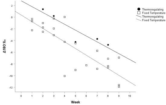 The same linear multiple regression analysis was conducted with the thermoregulating group, and the three different temperature treatments were pooled together as a second group since temperature was not significant in the previous analysis. Using treatment and time as independent variables, and ΔD as a dependent variable, the linear regression model was significant (F2,27 = 17.315, p < 0.001, r2 = 0.581). Within the model, effect of treatment was not significant (p = 0.873) and effect of time (week sacrificed) was significant (p < 0.001). The corresponding model using Δ18O as a dependent variable was significant (F2,27 = 32.281, p < 0.001, r2 = 0.721; see Figure 1). Within the oxygen model, both week sacrificed (p < 0.001) and treatment (p = 0.006) were statistically significant.