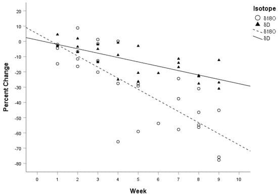 The least-squares regression lines for δD are indicated by the solid line (y = 0.00872 − 0.03x) and triangles and those for δ18O are indicated by the open circles and dashed line (y = 0.05 − 0.07x). Results of the analysis of covariance (ANCOVA) test for homogeneity of slopes found a significant difference in the interaction between isotope and week (F1,53 = 69.7, p < 0.001), indicating a significant difference in the slopes of the two regression lines. The intercept was not significantly different (F1,53 = 0.767 p = 0.385). The means of the isotopes were significantly different (F1,53 = 69.7, p < 0.001). This is consistent with experiments that used doubly labeled water, which showed oxygen isotopes to turn over at a greater rate than hydrogen isotopes.