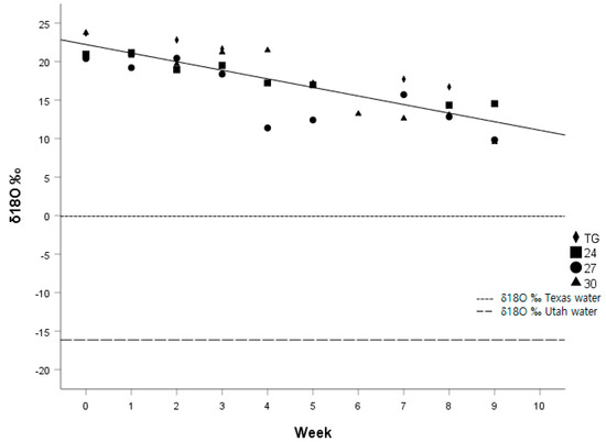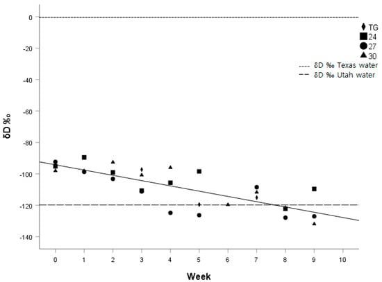 Before the experiment was conducted, we measured the δD and δ18O of the drinking water of both locations. The value of δD was −0.5‰ (+/− 1.0) and that of δ18O was −0.85‰ (+/− 0.40) for the Texas drinking water. The value of δD was −119.8‰ (+/− 1.0) and that of δ18O was −16.15‰ (+/− 0.40) for the Utah drinking water.