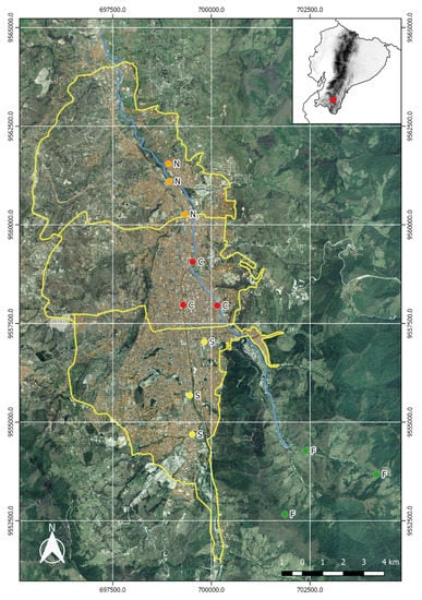 Study area in Loja Province (city of Loja), Southern Ecuador, showing the location of study sites for different levels of air pollution: Forests (F); South (S); Center (C) and North (N).