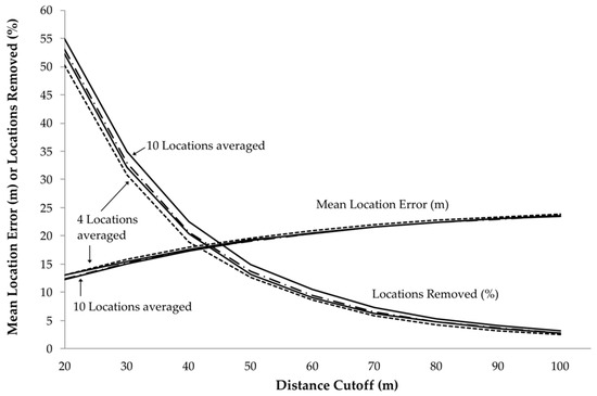 Mean LE in stationary tests declined from 27 to 20 m with the removal of outlier locations >60 m from the mean x and y coordinates calculated from a moving window of four locations before and four locations after. Outliers >60 m represented 9% of all locations. Removing outliers reduced LE from 18 to 15 m, 29 to 21 m, 28 to 21 m, and 33 to 24 m in open, deciduous forest, evergreen forest, and woody wetland cover types, respectively, and outliers that were removed comprised 3%, 10%, 10%, and 14% of location attempts. In the sensitivity analysis, mean LE and percent of outlying locations removed was similar whether 4, 6, 8, or 10 locations were included in the moving window (Figure 2).