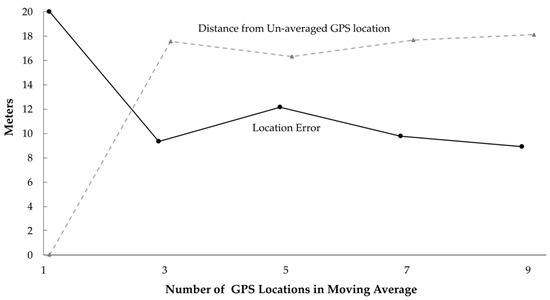 Mean LE for stationary tests was further reduced from 20 to 10 m when moving averages of up to nine total locations were applied to each screened GPS location. LE was reduced similarly in all cover types. Only four percent of locations could not be averaged with at least one other location because they were >60 min from other locations. The sensitivity analysis showed that a moving average of 3, 5, 7, and 9 adjacent GPS locations reduced mean LE to 9, 12, 10, and 9 m, respectively (Figure 3). The distance between the original location and the final location (i.e., after screening and averaging) was 18 m (SD = 11) and did not vary with the number of locations averaged (Figure 3).