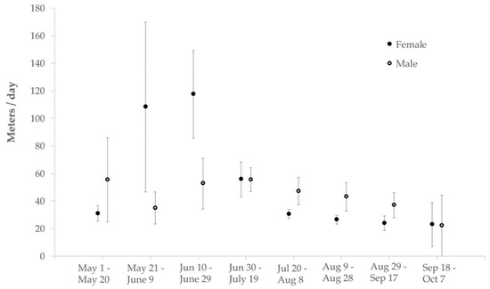 Net daily movement/day (mean ± SE) for 19 female and 10 male wood turtles (Glyptemys insculpta) from 24 May 2015 to 19 October 2015 and 30 April 2016 to 28 August 2016 in northeastern Minnesota. We calculated net daily movement for each turtle by subtracting the day’s mean x and y location from the next day’s mean x and y location and using the Pythagorean theorem.