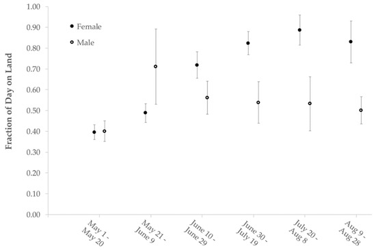 The proportion of time 19 female and 10 male wood turtles (Glyptemys insculpta) were on land (mean ± SE) based on GPS receiver locations and temperature loggers in northeastern Minnesota from 16 June 2015 to 17 July 2015 and 5 May 2016 to 28 August 2016.