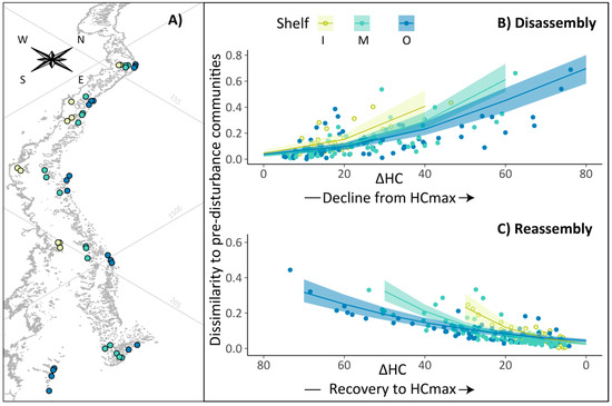 Coral community disassembly and reassembly across the continental shelf of Australia’s Great Barrier Reef. (A) Location of survey reefs, (B) hard coral community disassembly following coral cover decline (N = 144) and (C) coral community reassembly following coral cover recovery (N = 207) on inner-shelf (I), mid-shelf (M) and outer-shelf reefs (O). On (B,C), the y-axis represents the Bray–Curtis distance (dissimilarity) between disturbed and pre-disturbance community composition. ΔHC (%) represents the difference between the maximum coral cover observed at each reef and the coral cover measured at that reef in any given year. Envelopes show 95% credible intervals from the posterior distributions estimated from the Bayesian hierarchical model.