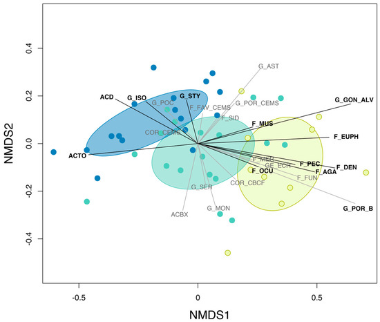 For each cross-shelf level, we identified the indicator taxa (i.e., hard coral groups) that characterized pre-disturbance communities based on the Dufrêne–Legendre index [34]. The Dufrêne–Legendre index identifies the taxa that are significantly more abundant in one group than in others; in our case, such groups were the three cross-shelf levels (inner-, mid-, outer-shelf). We subsequently quantified the contribution of each taxon to community disassembly or reassembly using a SIMPER analysis [35] based on the comparison of disturbed and pre-disturbance communities.