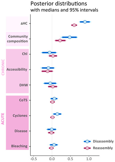 We first tested for any cross-shelf variation in disassembly (or reassembly) as coral cover changes by modelling disassembly (or reassembly) as a function of the ΔHC × SHELF interaction using a Bayesian hierarchical linear model with a reef random effect (Equation (1)). To investigate possible causative factors without any confounding cross-shelf effects, we used a second model set without SHELF, but with fixed effects coding for the composition of pre-disturbance communities (COMM; i.e., nMDS scores), chronic and acute stressors (Equation (2)). In this model set, the same set of chronic stressors were considered for each reef (i.e., irrespective of the year) while acute stressors referred to the disturbance(s) that preceded coral disassembly or reassembly in each year. In both model sets, we successively considered disassembly or reassembly as the response variable by splitting up the time series based on whether coral cover declined or recovered (Figure S1).