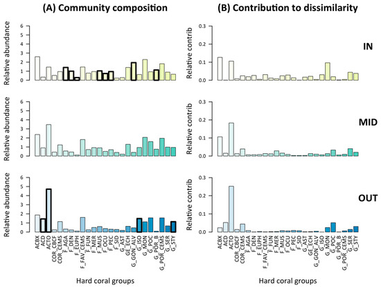 Composition of pre-disturbance hard coral communities (A) and relative contribution of each taxon to community dissimilarity (i.e., either disassembly or reassembly) following disturbance (B). Thick bar outlines in (A) show indicator taxa (Dufrene–Legendre index, P < 0.05) with, for inner-shelf reefs, F_AGA: encrusting, foliose and submassive Agariciidae; F_DEN: encrusting, foliose & massive Dendrophyllidae; F_EUPH: Euphyllidae; F_MUS: Mussidae; F_OCU: Oculinidae; F_PEC: Pectiniidae; G_GON_ALV: Goniopora and Alveopora; G_POR_B: branching Porites; and for outer-shelf reefs ACD: digitate Acropora; ACTO: tabulate and corymbose Acropora; G_ISO: encrusting and sub-masssive Isopora; G_STY: Stylophora. See Table 1 for other hard coral group codes and description.