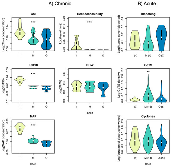 Distribution of chronic (A) and acute (B) stressors among inner (I), mid (M) and outer (O) shelf reefs. Violin plots represent data density, with plot width being proportional to the amount of data. Thick vertical lines represent the interquartile range, and the white dot the median. Asterisks show significant cross-shelf variation based on a Kruskal–Wallis test (***: P < 0.001; **: P < 0.01). For acute stressors, numbers in brackets represent the number of discrete disturbances. With Chl: long-term average of chlorophyll-a concentration; Kd490: light attenuation coefficient; NAP: non-algal particulates; DHW: Degree Heating Weeks; CoTS: outbreaks of the Crown-of-Thorns sea star (Acanthaster cf. solaris).