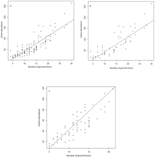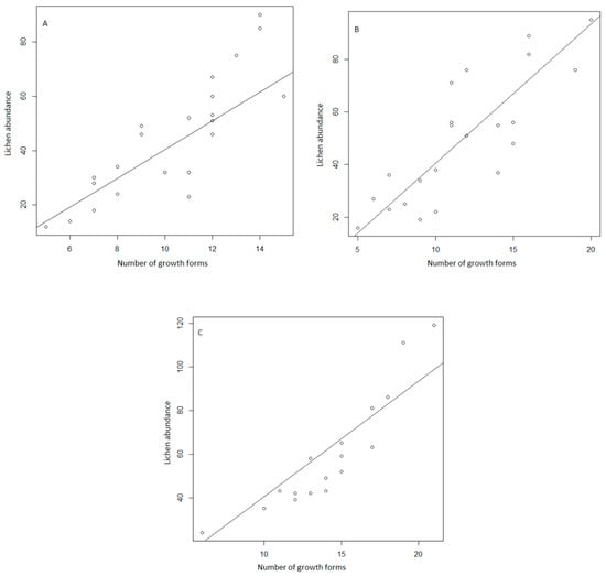 Results of the linear models based on the number of growth forms (x-axis) and epiphytic species abundance (y-axis) in European forests for: (A) Coniferous forests (y = 6.681x − 23.732, n = 22, R2 = 0.719), (B) Oak forests (y = 4.839x − 7.124, n = 22, R2 = 0.679), and (C) Beech forests (y = 6.597x − 34.437, n = 17, R2 = 0.827); p < 0.0001 in all cases.