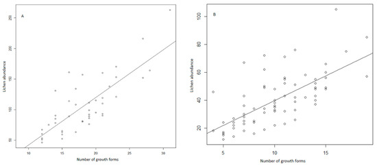 As we have already pointed out, previous studies have shown that under stressful conditions the number of species in a specific community should drop. In parallel, the number of functional traits and their variability should also diminish (i.e., functional convergence), at least when environmental filters control the community assembly [97,98,99]. This positive relationship between species abundance and growth forms diversity may be because a higher number of lichen species could represent a wider range of traits values as a consequence of functional complementarity [100]. In this way, the best well-preserved forests that harbor higher species abundance also harbor a greater diversity of growth forms.