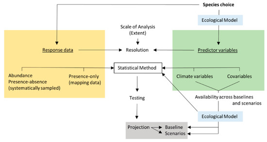 Example decision making framework for bioclimatic modelling; choice of species drives an initial ecological model that should consider how evidence from physiological studies might inform predictor variables (climate and covariables); species choice may also determine the relevant available distributional data, which needs to match at extent and resolution with the predictors; the ecological model (whether linear, nonlinear, with or without interactions) combines with the structure of response-predictor data to further determine the choice of statistical method; the statistical method is applied and tested and once validated is projected to the baseline and climate change scenarios; the use of scenarios can constrain the choice of predictors, in order to ensure that these are available at the same extent/resolution for both the baseline and climate change scenarios.