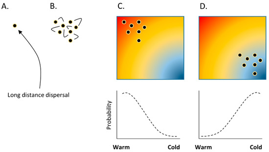 Graphic to demonstrate a null hypothesis of climatic control. (A.) Species larger-scale distributions can be shaped by long distance dispersal; (B.) Irrespective of environmental control, short distance dispersal can create aggregated distributions on ecological timescales; (C.) This aggregated distribution is compared to an autocorrelated climate surface to generate a ‘good’ statistical model; (D.) Randomly positioning the aggregated distribution in an alternative part of geographic space would generate a different but equally good model, rendering diagnostics for model fit spurious as hypothesis tests for climatic control of species distributions.