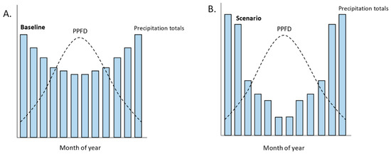 Graphic to demonstrate the potential for nonanalogue climates. Graphs (A.) (baseline) and (B.) (scenario) have the same annual total precipitation for a theoretical study site but distributed differently throughout the year; this can generate a contrasting relationship between precipitation totals and number of rain-days as alternative predictors of moisture availability. Furthermore, monthly precipitation totals have a different relationship with the solar cycle of photosynthetic photon flux density (PPFD) when comparing (A.) with similar moisture availability for low and high light periods and (B.) with higher moisture during a low light, and lower moisture during a high light period. Considering alternative interacting covariables such as light availability opens up the wide potential for nonanalogue climates, as future climate change is expected to shift moisture patterns seasonally, monthly and with respect to annual solar cycles.