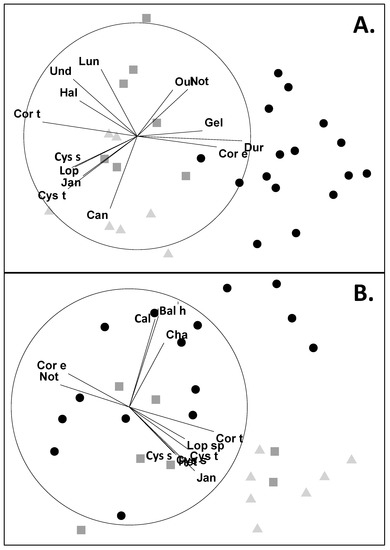 MDS of abundance data (A) and attachment links (B) showing relative similarity between plots dominated by Durvillaea spp. (n = 16, black circles), Undaria pinnatifida (n = 7, dark grey squares) or Cystophora spp. (n = 7, Light grey triangle) in September 2018 (all 30 plots were Durvillaea spp. habitats in 2012). Plot A stress = 0.16 and plot B stress = 0.19. Data were analysed with the Bray Curtis dissimilarity index. Vector overlays represent 50% of the total community variation. See online supplement 1 for species abbreviation list.