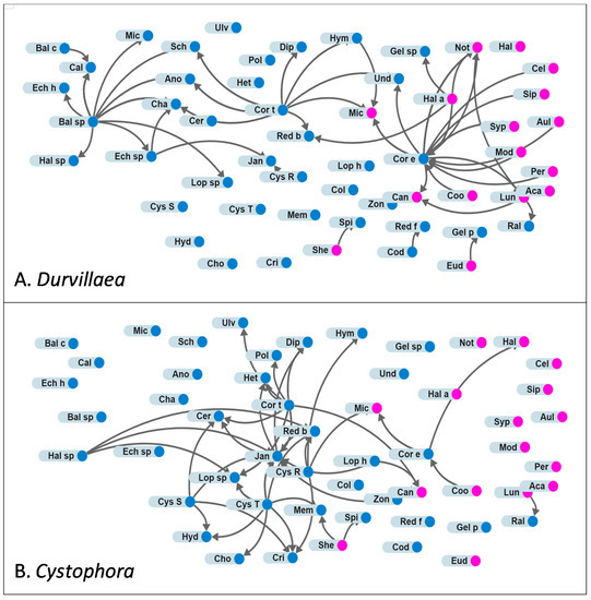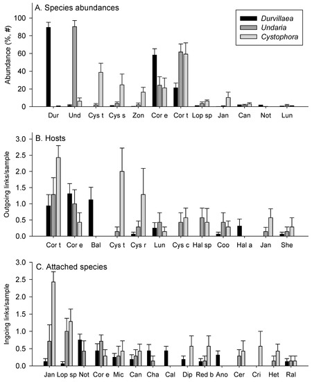 The number of (attached) ingoing links were also higher in plots dominated by Cystophora spp. compared to plots dominated by Durvillaea spp. or U. pinnatifida (Figure 3C). Common attached species in the Cystophora spp. plots included J. sphaeroramosa, L. hirtum, Micrelenchus spp., Cantharidella spp., Dipterosiphonia heteroclada, Ceramium spp., Cricophorus nutrix, Heterosiphonia sp. and an unidentified diminutive red alga. By comparison, U. pinnatifida had intermediate, and Durvillaea spp. low numbers of ingoing links, characterised by small macroalgae (C. coliformis, C. calibletharoides and Anotrichium crinitum) and the diminutive limpet Notoacmea spp. (Figure 3C).