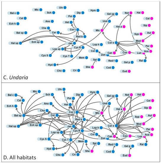 Networks showing interactions between hosts (with outgoing arrows/links) and attached species (with incoming arrows/links) in plots dominated by Durvillaea spp. (A. n = 16), Cystophora spp. (B. n = 7), Undaria pinnatifida (C. n = 7) and across all three habitats (D. n = 30) in September 2018 (all 30 plots were Durvillaea spp. forests in 2012). Blue = sessile species, Pink = mobile species.