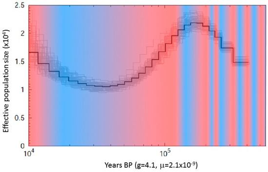 - Nadachowska-Brzyska, K.; Burri, R.; Smeds, L.; Ellegren, H. PSMC analysis of effective population sizes in molecular ecology and its application to black-and-white Ficedula flycatchers. Mol. Ecol. 2016, 25, 1058–1072. [Google Scholar] [CrossRef]