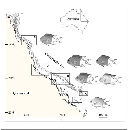Figure 1. Location of latitudes sampled for Acanthochromis polyacanthus on the Great Barrier Reef (GBR) with inserts indicating latitudinal positions as follows: Lizard (a), Townsville (b), Whitsunday (c), Swains (d), and Capricorn/Bunker (e). Outlines of the color morphs of Acanthochromis polyacanthus by latitude are provided; larger images in color are provided in Figure S1 (Supplementary Materials).
