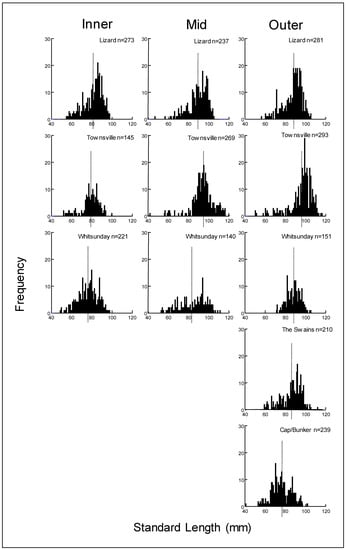 Figure 2. Length–frequency distributions for A. polyacanthus collected from the 11 positions on the GBR (reefs pooled within distances). The mean for each histogram is presented as a dotted line.