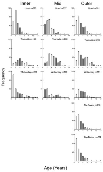 Figure 3. Age–frequency distributions for A. polyacanthus collected from the 13 reefs pooled within distances at each latitude.