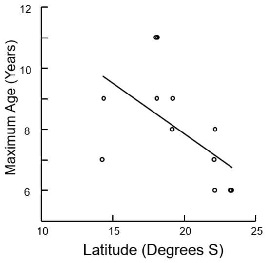 Environmental factors are often correlated with demographic characteristics. There are a number of models that relate to latitude and sea water temperature. Tropical gradient models (TGM) state that one or a combination of age-max, length-max, growth, and growing season decrease from low latitude to high latitudes [1,2,6]. This pattern closely aligns with the temperature size rule (TSR) where reduced growth rate correlates with a drop in temperature [7]. It is of course assumed that temperature drops with latitude, although this may vary in accuracy with the latitudinal range studied and oceanography. The TSR aligns with “metabolic theory”, where metabolic rate varies with temperature, and this in turn can have a strong influence on demographic patterns such as age, growth, and mortality [8]. In some cases, a TGM pattern can be found for growth whilst length to infinity can increase with latitude [7]. Counter gradient models (CGM) state that age-max (AMAX), length-max, or growth will increase from low latitude to high latitude (e.g., References [6,9]). In the case of some surgeon fishes, age-max increases with a decrease in temperature but, due to variation in oceanography, does not increase as predictably with latitude [10]. Bergmann’s rule and James’s rule refer to an increase in body size with latitude [11,12]. At some spatial scales, regional differences in demographics were not found to vary predictably over many degrees of latitude (e.g., 12°, Cromileptes altivelis [13]). For any correlative study, it is often challenging to provide a strong case for any of these patterns without sampling a wide latitudinal range and having multiple sampling sites.