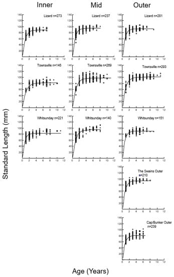 Acanthochromis polyacanthus was an ideal species for the study of patterns of size, age, and growth, as it is found over a broad latitudinal range on most reefs at inner, mid, and outer distances across the continental shelf [14,27]. The distribution and abundance of the species, therefore, allowed for high spatial resolution of the aforementioned patterns. The species is also not targeted, where selective fishing could affect patterns of size and age. A. polyacanthus is highly sedentary in that they are protected in a brood by adults once the eggs hatch [28]. Once they leave, the broad breeding pairs are established, and they rarely venture more than 10s of meters during their lives. Environmental influence on growth, therefore, would be highly localized as no broad-scale movements are undertaken. The documented age maximum of the species is 11 years [26].