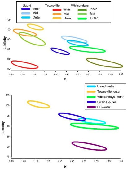 Figure 6. Kimura plots showing 95% confidence ellipses for the parameters K (growth coefficient) and L (mean asymptotic length) for (A) latitudes with inner mid and outer collection reefs and (B) latitudes where collections where only made at outer reefs.