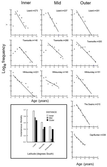 Instantaneous mortality rates ranged from 0.69 at Lizard, inner to 0.245 at Whitsundays, mid (Table 2, Figure 7). Mortality rates were consistently higher at inner shelf reefs (Figure 7). This pattern was also apparent from age–frequency, where the representation of fish greater than four years old was relatively low when compared to mid and outer reefs at the same latitude (Figure 3). Although there was a strong trend for mortality rates to drop with latitude among outer reefs (13 reefs), this relationship was not significant (ANOVA for slopes). The relationship was largely derailed by high mortality rates that were detected at the Swains. When all instantaneous mortality relationships were considered, they explained 41% to 65% of the variation in these relationships. The dependency of the relationships on young and small fish under three years old varied among reefs, but there was no consistency with latitude or distance that could have confounded the conclusions relating to spatial differences.