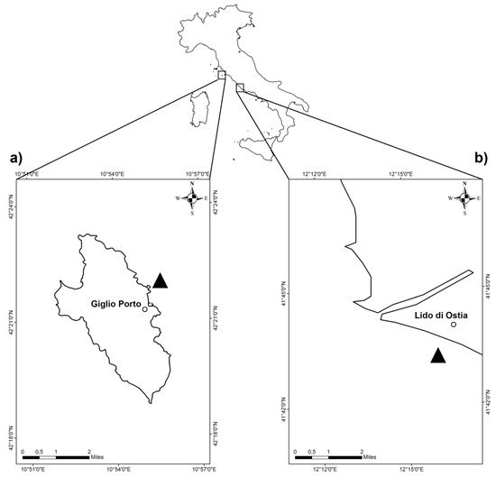 Study areas (a) Giglio Island and (b) Latium coast, with the locations of the sampling sites (black triangles) being Punta del Lazzaretto and Lido di Ostia, respectively.