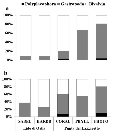 Percentages of abundance (%DI—a) and species richness (%DQ—b) of Polyplacophora, Gastropoda and Bivalvia for each habitat (SABEL—S. alveolata reef; HARDB—hard bottom with photophilic algae; CORAL—coralligenous concretion; PHYLL—P. crispa sciaphilic assemblage; PHOTO—shallow photophilic assemblage) and site (Lido di Ostia; Punta del Lazzaretto).