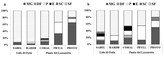 Samples were collected by SCUBA divers during late spring and summer of 2014. On SABEL, HARDB, PHOTO, and PHYLL, four replicate samples were collected by scraping the bottom within a 20 × 20 cm frame for a total thickness of 5 cm, using a hammer and chisel, and holding a 50 µm mesh bag below the sampling plot in order to minimize the loss of organisms. Sampling efforts were reduced on CORAL to four replicate samples with a surface of 10 × 10 cm and a thickness of 10 cm [14]. Then, samples were stored in 4% formaldehyde seawater solution to be transported to the laboratory, where the macrobenthos was sorted. All molluscs found were preserved in 70% alcohol solution and then identified to the lowest possible taxonomical level under a Leitz stereomicroscope.